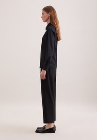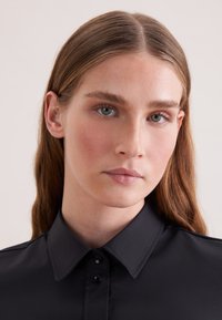 Femme aux longs cheveux bruns portant une chemise noire ajustée à boutons et un pantalon noir, debout devant un fond clair uni.