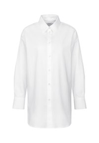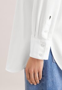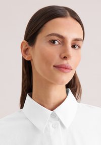 Femme aux cheveux bruns raides portant une chemise blanche à boutons surdimensionnée à manches longues et un jean bleu, posant devant un fond beige uni.
