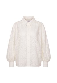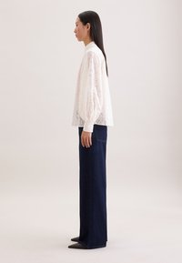 Femme portant un chemisier transparent en dentelle blanche à boutons avec des manches longues bouffantes et un jean bleu foncé, debout devant un fond uni.