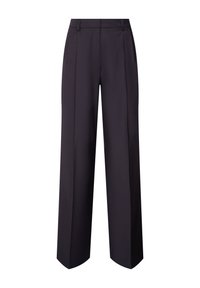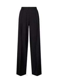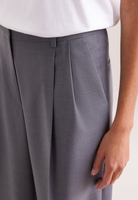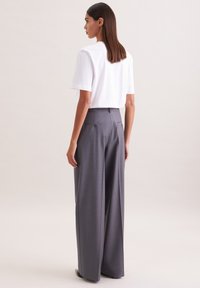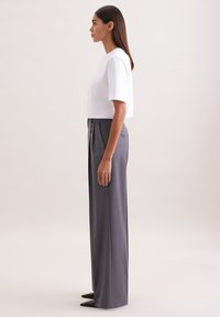 Femme portant un pantalon gris à taille haute et jambes larges, avec des chaussures noires à bouts pointus, debout les mains détendues le long du corps sur un fond uni.