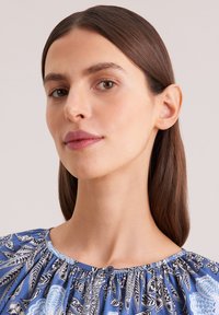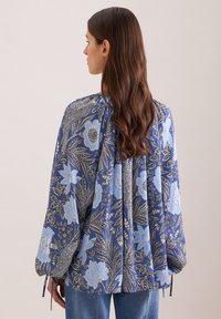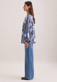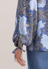 Femme portant une blouse à manches longues à motif floral bleu avec des poignets à cordon de serrage et un jean bleu clair sur un fond uni.