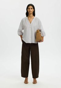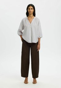 Femme portant une blouse blanche ample à fines rayures verticales et manches bouffantes trois-quarts, associée à un pantalon marron foncé, debout immobile.