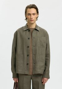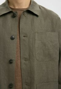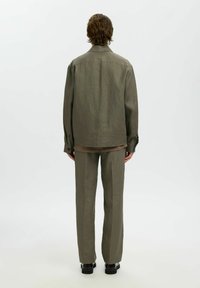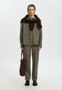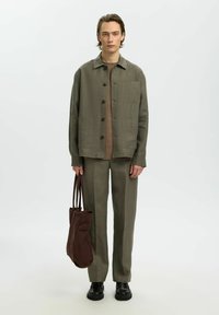 Jeune homme portant une veste boutonnée vert olive et un pantalon assorti, tenant un sac marron, faisant face avec une expression neutre sur fond blanc.