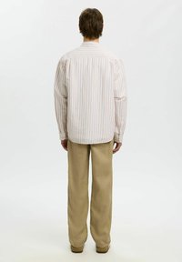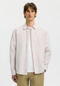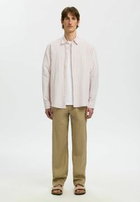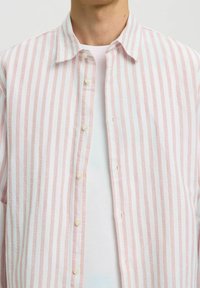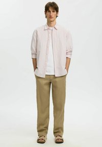 Jeune homme portant une chemise à rayures verticales roses et blanches par-dessus un t-shirt blanc et un pantalon beige, debout devant un fond uni.