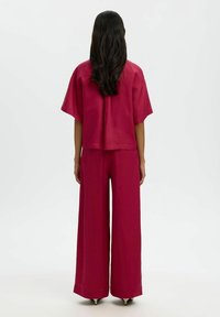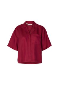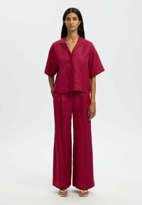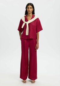 Femme aux longs cheveux bruns portant une chemise rouge à manches courtes et ample avec une poche sur la poitrine, accompagnée d'un pantalon rouge assorti, sur un fond uni.