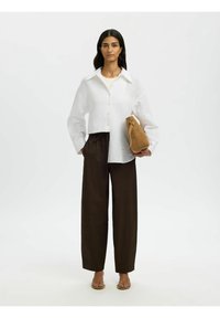 Femme aux cheveux longs et foncés portant une chemise blanche ample à boutons et un pantalon marron foncé, debout devant un fond uni.
