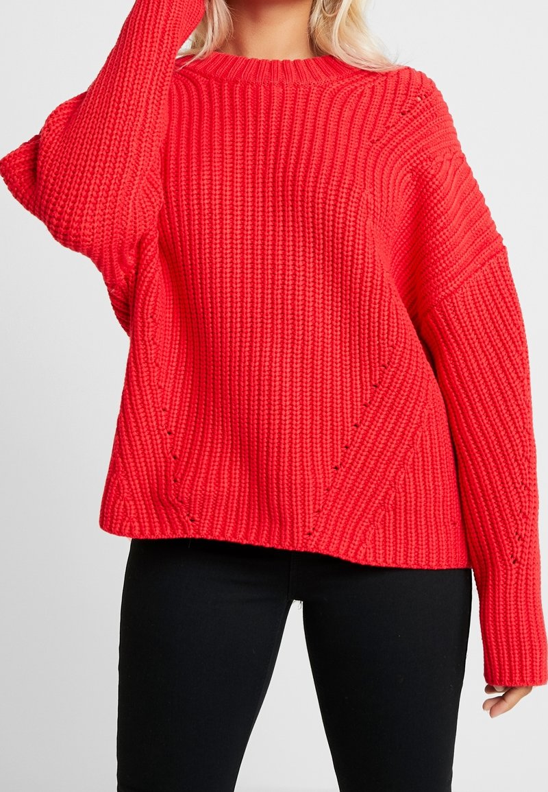 Pull rouge en tricot avec texture côtelée, doté d'un col rond, d'épaules tombantes et de coutures diagonales pour plus de détails.