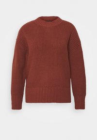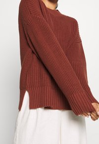 Personne portant un pull ample en maille de couleur rouille avec des manches longues, associé à un pantalon large blanc, sur un fond uni.
