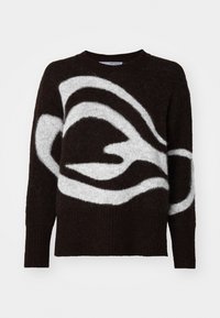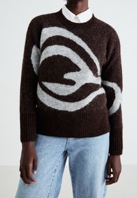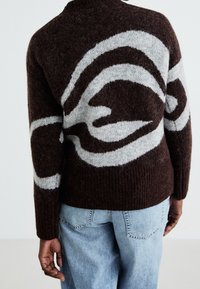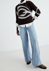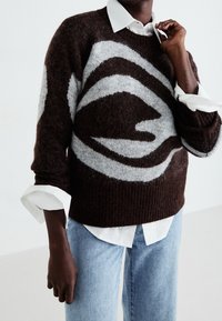 Personne portant un pull pelucheux brun foncé avec un grand motif abstrait en tourbillon gris clair, une chemise blanche à col et un jean bleu clair.