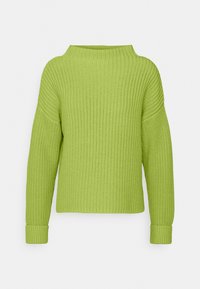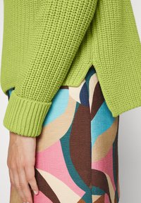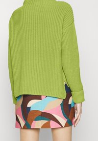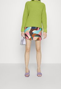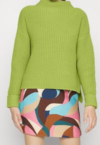 Pull vert en maille avec un col haut et une texture côtelée, associé à une mini-jupe colorée à motifs abstraits avec des formes courbes.