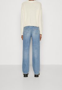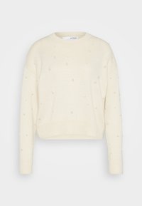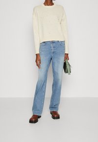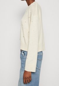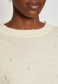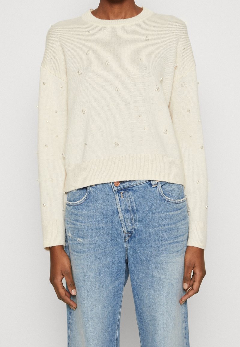 Pull en maille crème avec de petites perles décoratives porté avec un jean taille haute bleu clair sur une personne à la peau de ton moyen-foncé.
