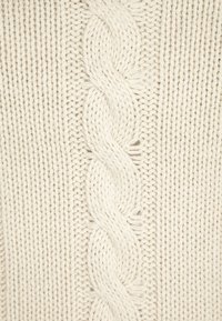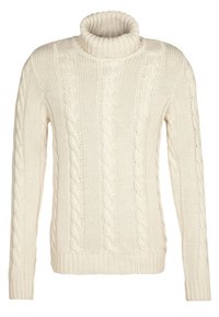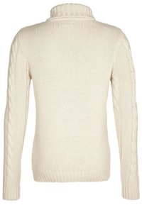 Pull à col roulé tricoté de couleur crème avec des motifs torsadés sur le devant, manches longues, poignets et ourlet côtelés.