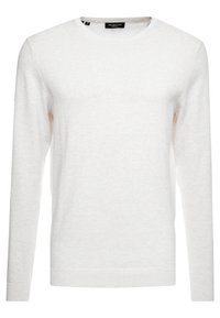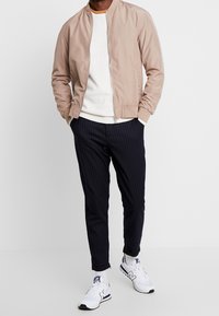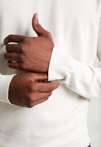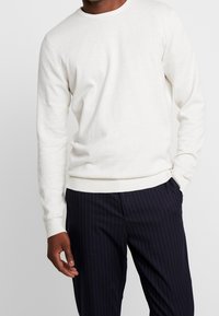 Homme portant un pull à manches longues blanc uni et un pantalon bleu marine à fines rayures, une main dans la poche.