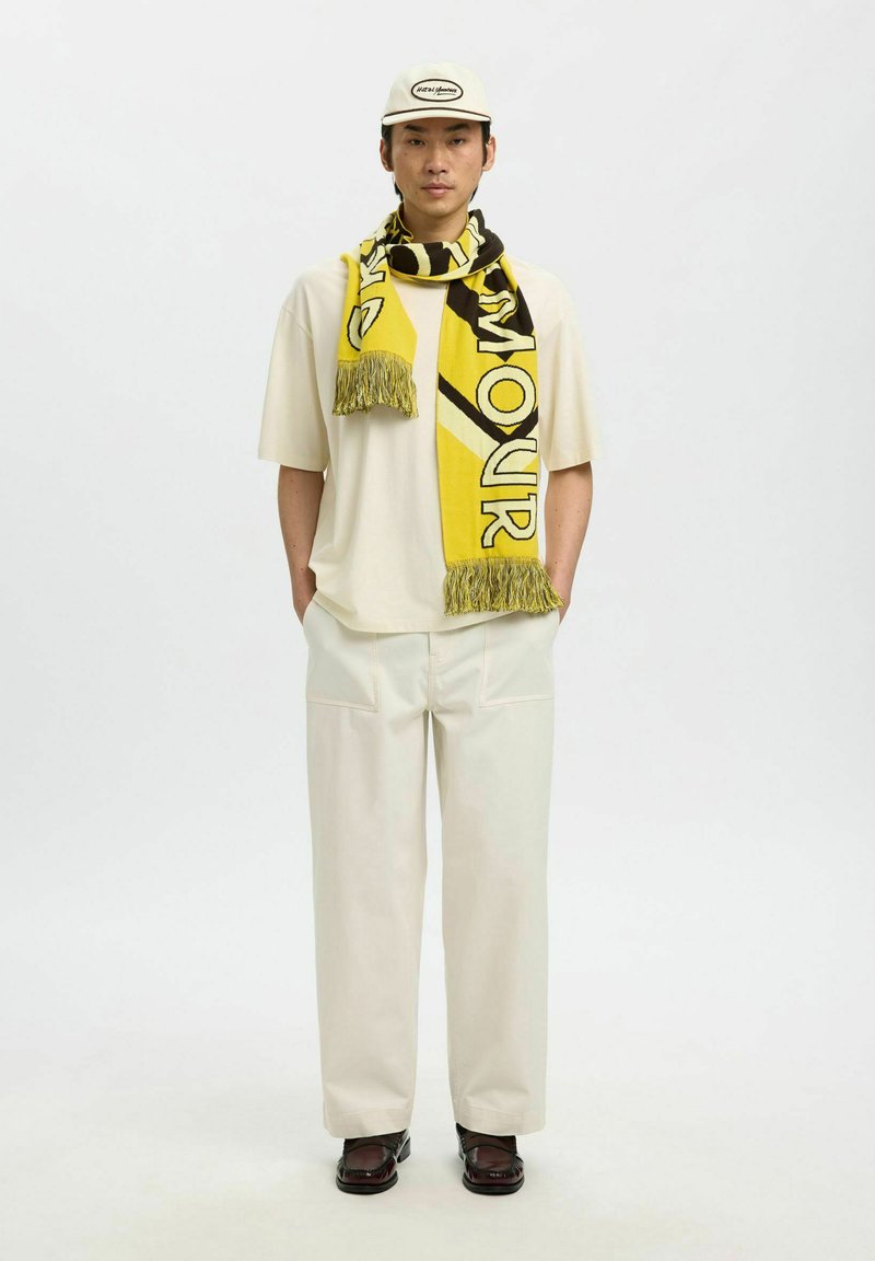 Homme portant une tenue crème avec une écharpe à motifs jaunes et noirs, une casquette crème et des chaussures marron foncé, debout les mains dans les poches.