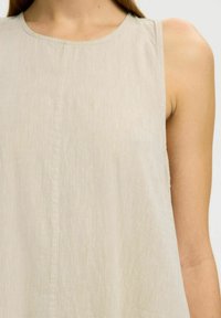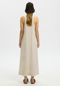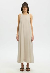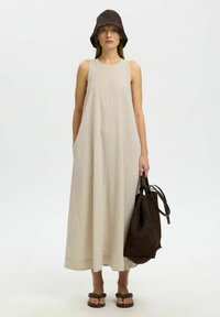 Femme portant une robe maxi beige sans manches, un chapeau seau tricoté marron et des sandales rembourrées foncées, debout sur un fond blanc uni.