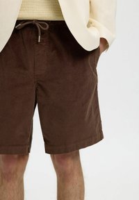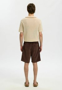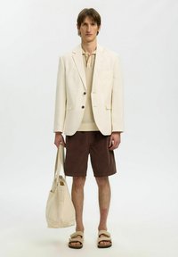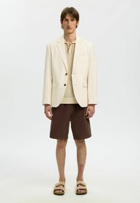 Homme portant un short en velours côtelé marron, des sandales beiges à double bride, un pull en tricot crème et un blazer beige clair, debout les mains dans les poches.