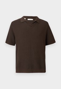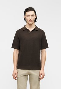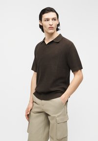 Jeune homme aux cheveux foncés portant un polo à manches courtes marron foncé texturé et un pantalon cargo beige clair, debout devant un fond uni.