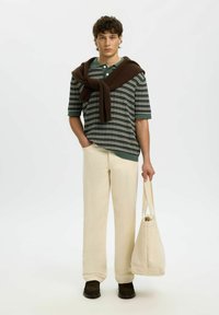 Jeune homme aux cheveux bouclés portant un polo en maille à manches courtes vert à rayures et un pantalon beige clair, debout avec une main dans la poche.