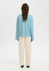Polo à manches longues rayé bleu et crème avec un col en V et une coupe décontractée. Confectionné dans un tissu léger, avec un discret logo en accent.