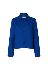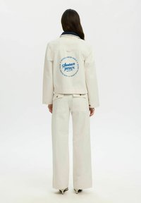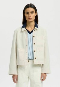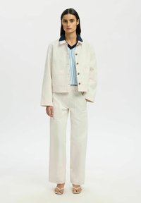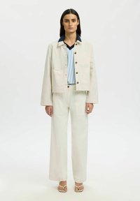 Femme aux cheveux foncés portant une veste crème à boutons par-dessus une chemise rayée bleu clair et un pantalon crème assorti, debout devant un fond uni.