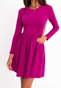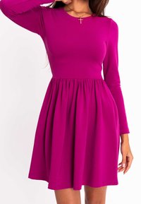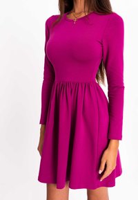 Robe fuchsia à manches longues avec un corsage ajusté et une jupe évasée, réalisée en tissu lisse, avec des fronces à la taille.
