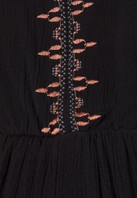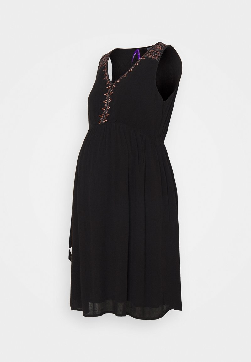 Robe de maternité noire avec un décolleté en V profond, sans manches, taille froncée et broderie florale colorée le long du col. Tissu léger.