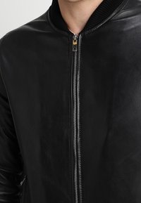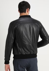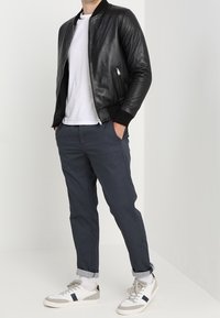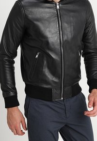 Homme portant une veste bomber en cuir noire sur un t-shirt blanc et un pantalon foncé à motifs, les mains le long du corps.