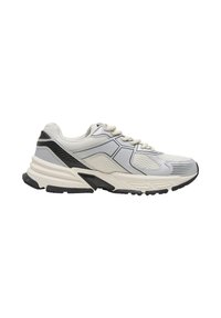 Baskets athlétiques blanches et grises avec une tige en mesh, des accents de semelle noirs, une fermeture à lacets et le logo "Sergio Tacchini" sur le côté.