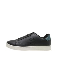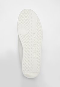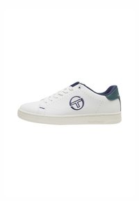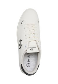 Baskets basses blanches avec lanière de talon noire, logo circulaire noir sur le côté, design à lacets et semelle plate.