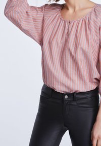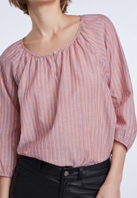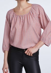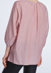 Blouse rose pâle avec des rayures verticales blanches, col rond et manches trois-quarts, avec un détail de boutons à l'avant.