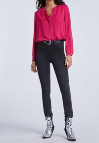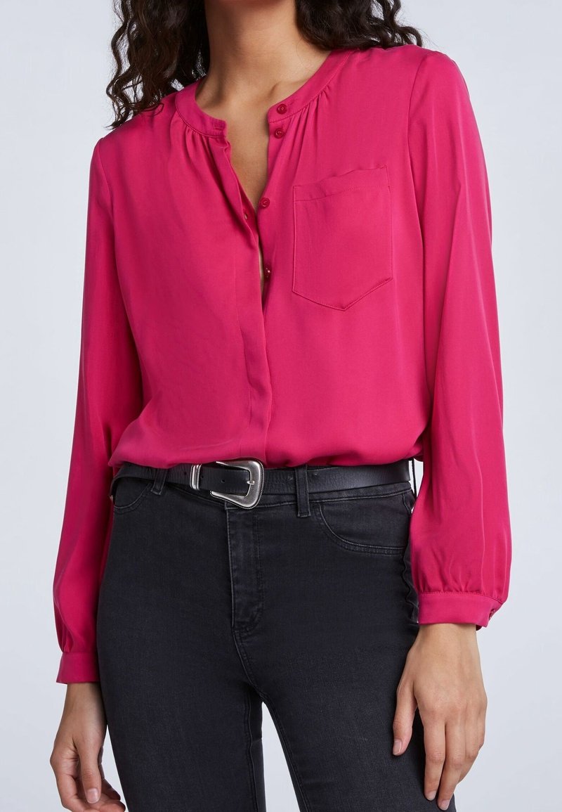Femme portant un chemisier rose vif boutonné avec une poche poitrine, rentré dans un jean noir taille haute avec une ceinture noire.