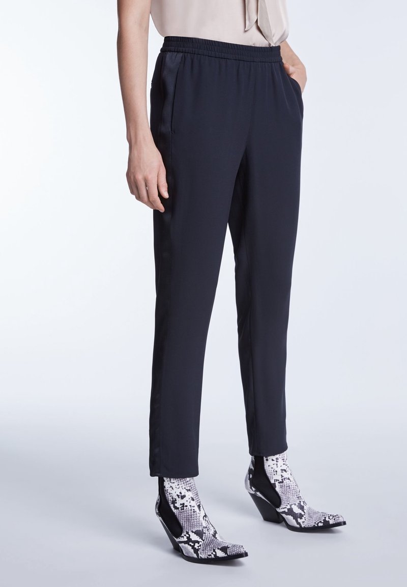 Pantalons noirs, ajustés, avec taille élastique et poches latérales, associés à des bottines à motif serpent avec un talon compensé.