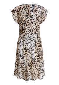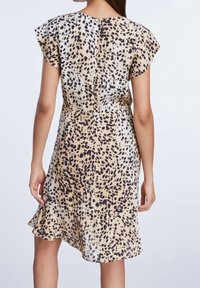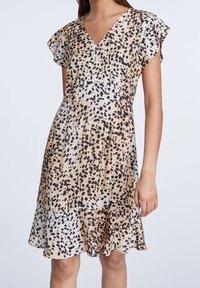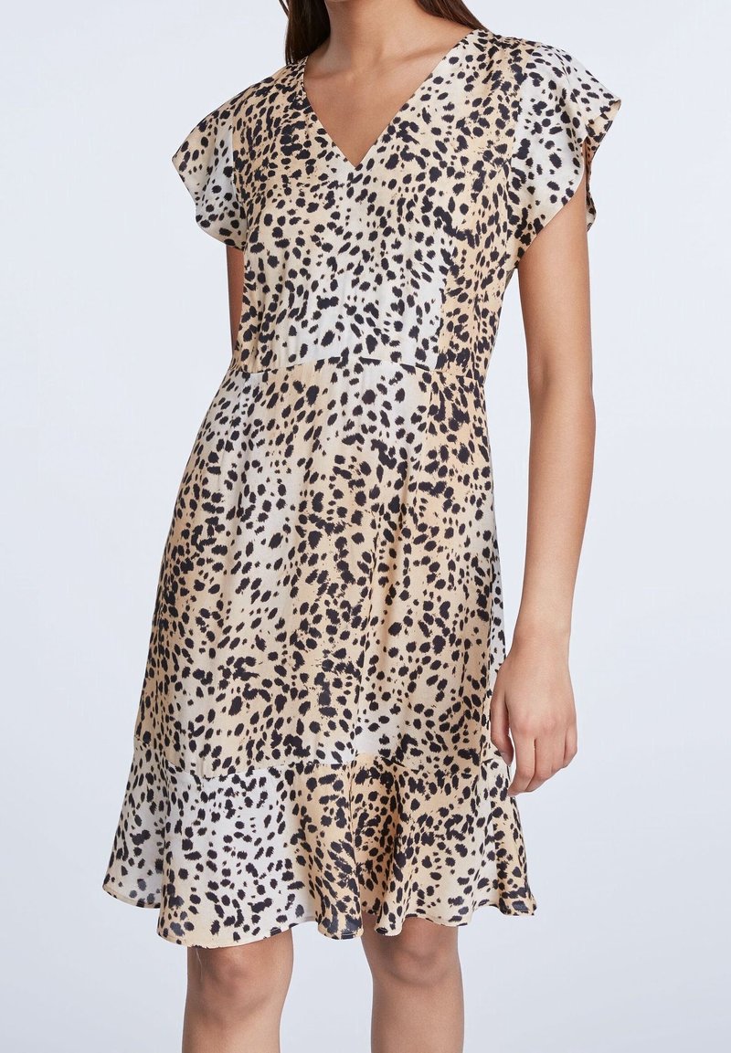 Femme portant une robe à manches courtes à col en V beige et noir à motifs tachetés, avec un ourlet évasé, sur un fond clair uni.