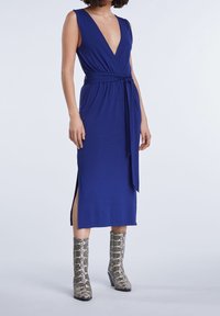 Robe portefeuille bleu marine avec un décolleté en V profond, sans manches et une taille nouée. Texture lisse avec une longueur mi-mollet et une fente sur le côté.