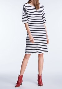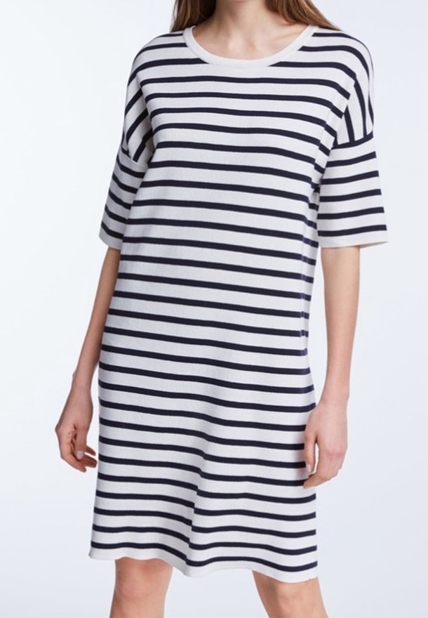 Femme portant une robe blanche mi-genoux avec des rayures horizontales noires et des manches jusqu'aux coudes, sur un fond uni.