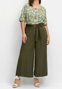 Pantalon large couleur vert olive avec plis et taille nouée. Associé à des sandales espadrilles blanches ornées de nœuds.