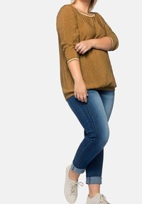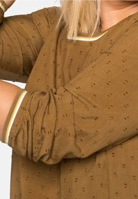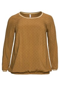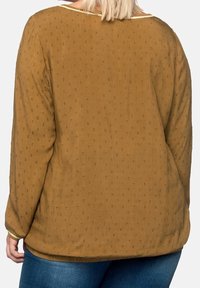 Haut marron à manches longues avec motif texturé, présentant un col rond et une bordure contrastante aux manches. Coupe décontractée.