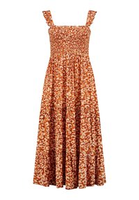 Robe maxi orange avec imprimé animal, dotée d'un corsage smocké, de larges bretelles et d'une jupe à volants. Assortie avec des sandales tressées.