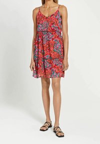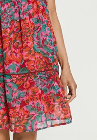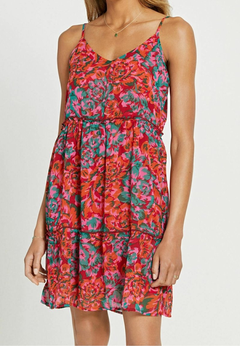 Femme portant une robe sans manches à motif floral rouge, rose, orange et vert, accessoirisée d'un collier délicat et de bracelets.