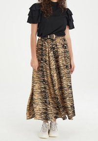 Blouse noire à manches volantées, assortie à une jupe beige ornée de rayures noires de tigre. Comprend une ceinture marron avec des accents dorés.