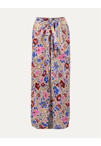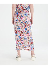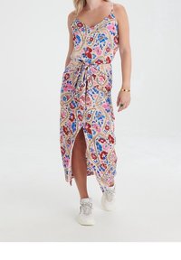 Femme portant une jupe longue à motif floral avec une fente à l'avant, des baskets blanches épaisses, un bracelet en or et des bagues aux doigts.
