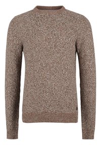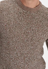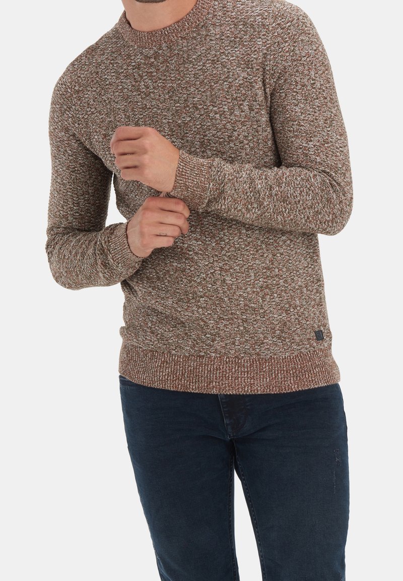Homme ajustant le poignet d'un pull marron texturé en maille, portant un jean bleu foncé, sur fond clair.