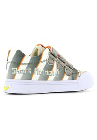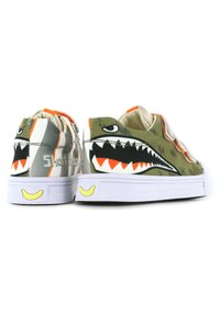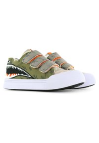 Baskets en toile verte avec un graphisme de requin, capuchon en caoutchouc blanc et trois bandes Velcro grises. Présente des accents orange et noirs.