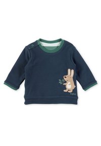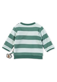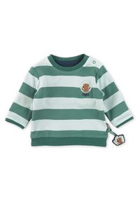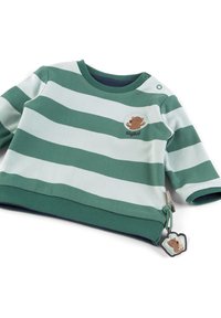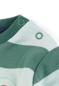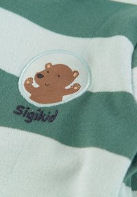 Pull pour bébé rayé vert et blanc avec un patch ours sur la poitrine et une attache-sucette assortie en forme d'ours.