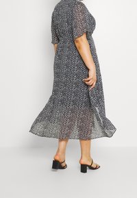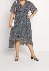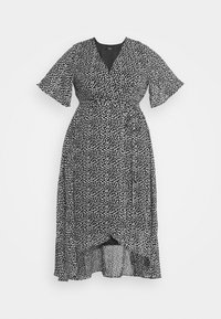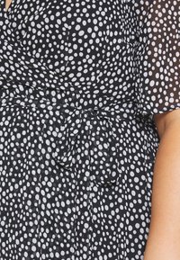 Robe portefeuille à pois noire et blanche avec des manches flottantes, un ourlet inégal et une taille cintrée ; confectionnée en tissu léger et transparent.