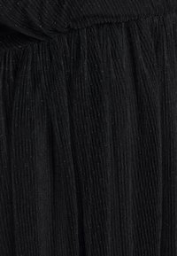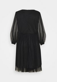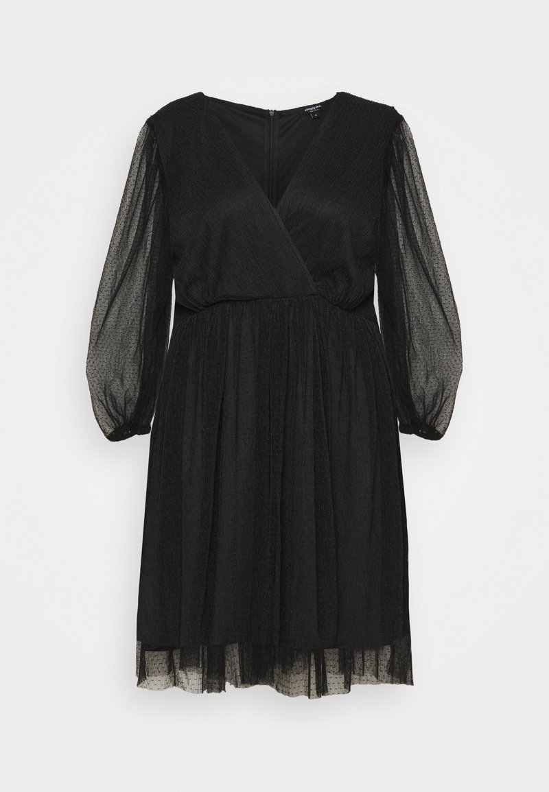 Robe noire avec un décolleté en V profond, des manches longues transparentes, un corsage ajusté et une jupe fluide. Tissu texturé, ourlet arrivant au genou, et fermeture éclair au dos.