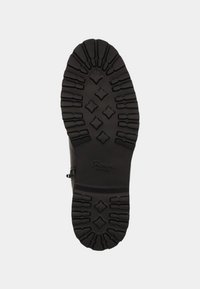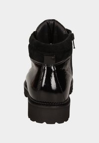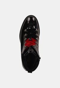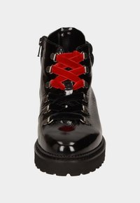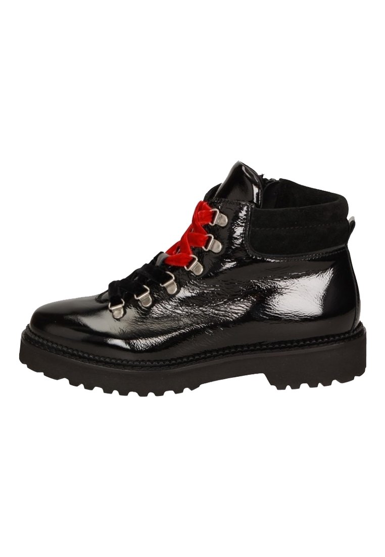 Bottes noires en cuir verni avec lacets rouges et noirs, ferrures argentées, et semelle épaisse en caoutchouc noir. Détails en daim au col.