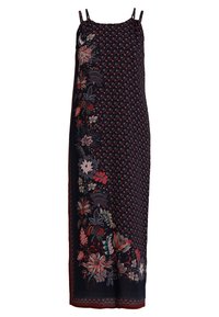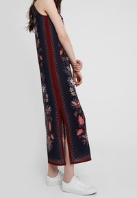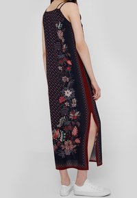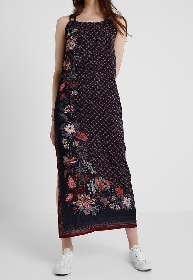 Robe longue bleu marine foncé avec broderie florale en rouge, rose et vert. Présente des bretelles fines et des fentes latérales pour une plus grande liberté de mouvement. Baskets blanches.