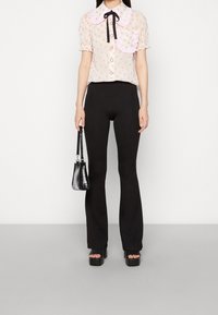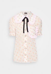 Blouse transparente avec un motif floral en rose et orange, dotée d'un grand col rayé, d'un ruban noir et de détails de poche froncés.