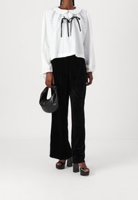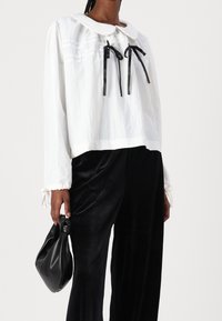 Personne portant un chemisier blanc à manches longues avec un col arrondi et deux nœuds en ruban noir sur la poitrine, associé à un pantalon noir.